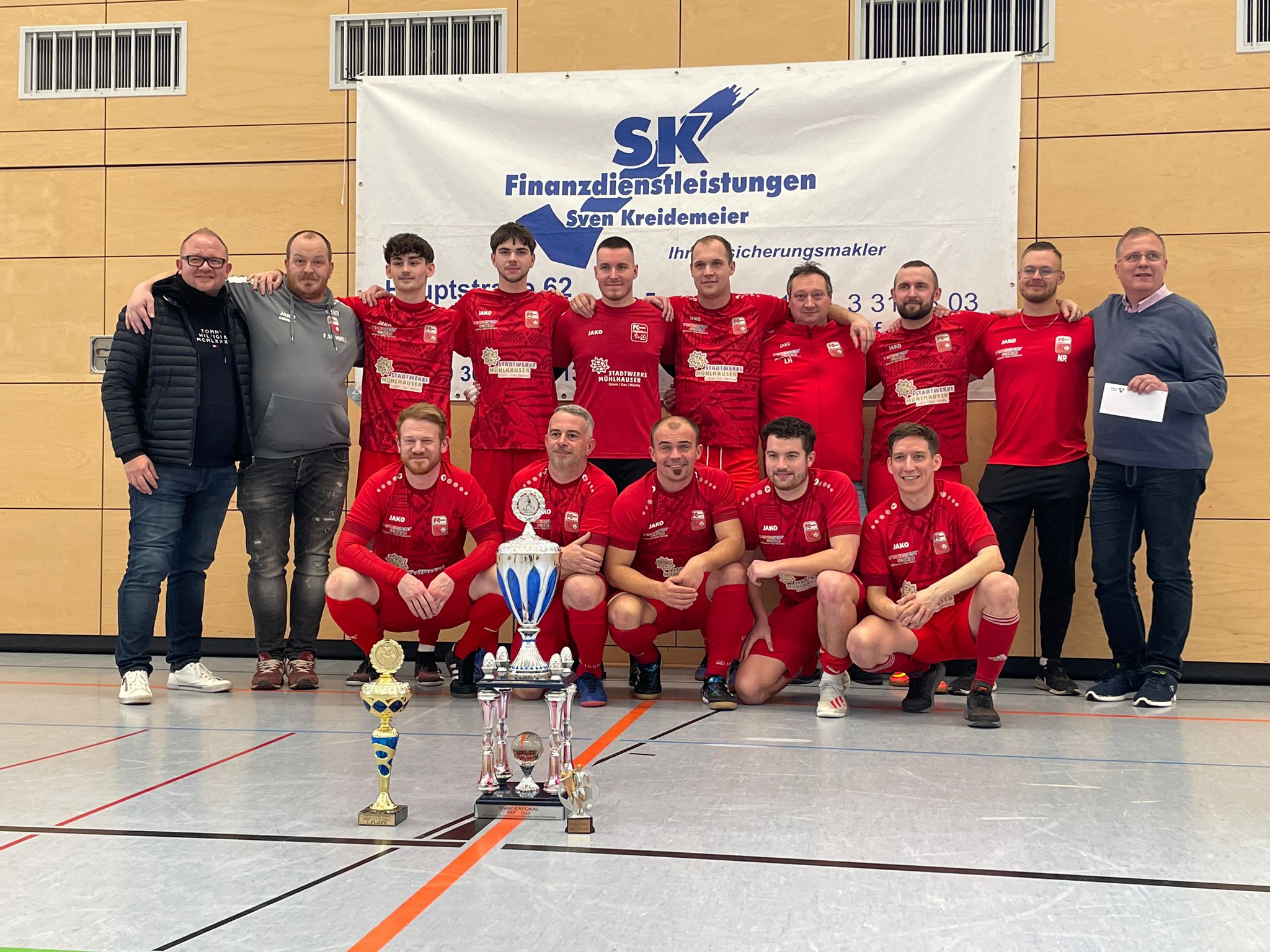 Nach nur einer ersten Trainingseinheit am Donnerstag trat ein Teil der 1. Mannschaft beim 18. SKF Cup in Heringen an. Dort trafen unsere Jungs in der Vorrunde auf die SG Sundhausen (5:0), LSG  Blau Weiß Großwechsungen (6:0) und FSG 99 Salza (5:0). Nach der makellosen Gruppenphase ging es im Halbfinale gegen Gastgeber Germania Heringen richtig eng zu, bevor man sich im Neunmeterschießen 4:3 durchsetzen konnte. Im Finale trafen die Schützlinge von Trainer Patrick Krumbholz auf Landesklässler SV National Auleben. Es ging spannend hin und her, ehe sich unsere Jungs 4:3 den Turniersieg sichern konnten. Vom Veranstalter erhielten die Eisernen eine Siegprämie von 150 Euro. Das Team und der Vorstand erhöhten den Betrag auf 350 Euro und übergaben den Betrag an den Bürgermeister von Heringen für die Flutopfer in Heringen. Eine tolle Geste, die beweist, das es wichtigere Dinge im Leben gibt und man sensibel und verantwortungsbewusst auf die Dinge um einen herum reagieren kann.