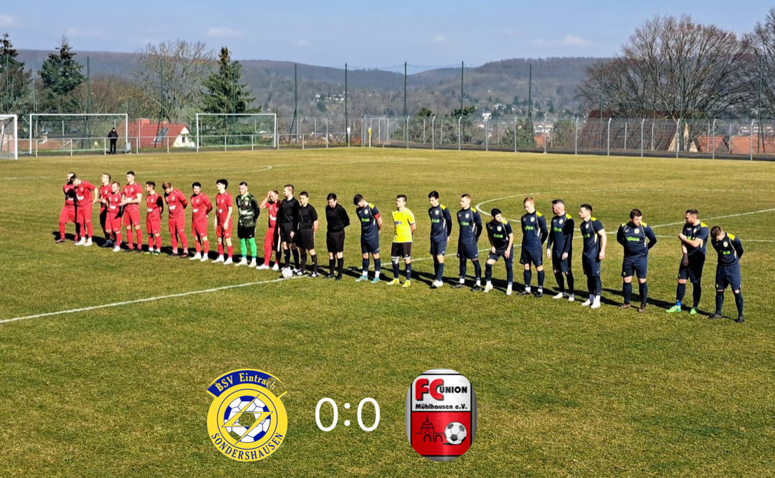 Der Auswärtsaufgabe des FC Union Mühlhausen beim Schlusslicht der Thüringenliga BSV Eintracht Sondershausen endete mit einem torlosen Remis.Den besseren Start in das Nachbarschaftsduell erwischten die Mühlhäuser, die schon nach zwei Minuten eine erste Gelegenheit durch Tom Fränkel besaßen, der aber an Eintrachts Schlussmann Hannes Byrenheid scheiterte. Das gleiche Duell gab es dann noch mal, diesmal parierte Sondershausens Torwart den Fränkel- Freistoß per Fußabwehr (16.). Rs war danach ein zerfahrenes Match mit wenigen brenzligen Situationen in beiden Strafräumen. Es ging zwar hin und her, doch war zumeist am gegnerischen Strafraum der jeweilige Angriff zu Ende, weil beide Abwehrketten nichts gestatteten. Union konnte nur bei einem Freistoß von Sven Bernsdorf, der über den Kasten ging, für Torgefahr sorgen (32.). „ Beide Mannschaften agierten aus kompakten Defensivverbund heraus, so passierte recht wenig in Punkto Torgefährlichkeit“, musste Unions Trainer Patrick Krumbholz feststellen. Das blieb auch in Hälfte zwei so, die Eintracht hatte zwei gefährliche Aktionen, jedoch verfehlten Patrick Rothe per Schuss und Max Teubner per Kopf den Mühlhäuser Kasten. Die beste Gelegenheit auf den entscheidenden Treffer hatten jedoch die Unioner, doch klatschte ein Schuss von Christian Brehm nur an den linken Pfosten (70.). „Beide Teams hatten sich eine Defensivtaktik auferlegt, wollten auf keinen Fall verlieren.Dann kommt so ein Spiel heraus, wo beide in ihren Bemühen nach vorne ängstlich wirkten. Wir haben den Abstand zur Eintracht gehalten, man muss auch mit kleinen Erfolgen mal zufrieden sein“, so Krumbholz nach der Partie, die auch keinen Sieger verdiente. .Positiv für die Eisernen, ihnen gelang es zum ersten Mal in der Saison ohne Gegentreffer zu bleiben.