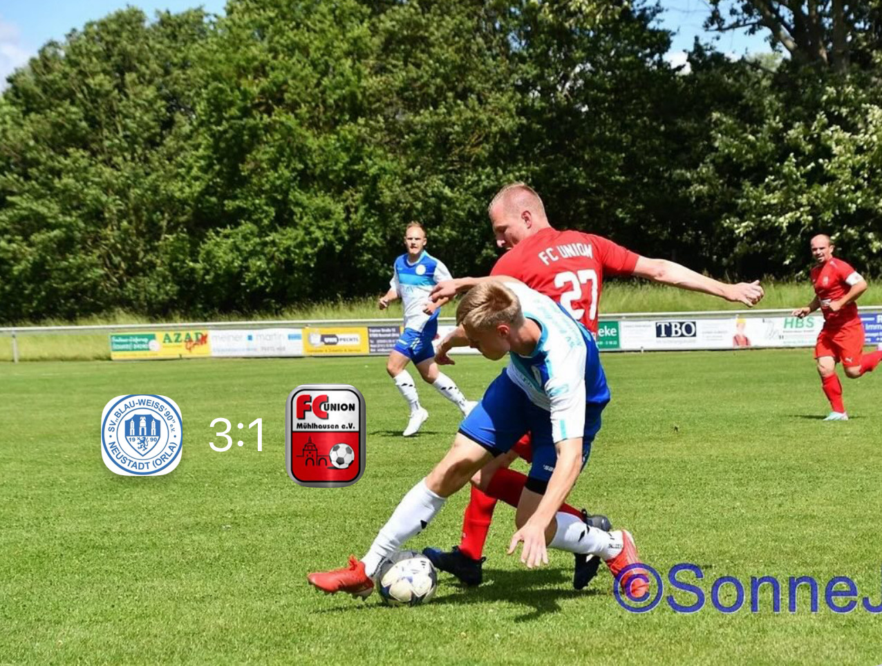 Die Landesklasse hat den FC Union Mühlhausen wieder, weil das kleine Fußballwunder am letzten Spieltag ausgeblieben ist. Beim favorisierten und spielstarken Mitaufsteiger SV Blau Weiß 90 Neustadt/Orla gab es für die Eisernen mit 1:3 nichts zu holen. Da die Schweinaer ihre Hausaufgaben mit dem 3:2- Heimsieg über den SV Schott Jena erledigten, geht es für die Mühlhäuser wieder eine Klasse runter. Die Gäste wollten alles geben und das taten sie auch, doch der Start ins Match versetzte (wie zuletzt des öfteren) einen frühen Dämpfer. Diesmal gerieten die Eisernen nach einem direkt verwandelten Freistoß von Eliah Abraham Walther nach drei Minuten in Rückstand-1:0 (3.). Das beflügelte die Neustädter, die in der Folgezeit mehr vom Spiel hatten. Sie kamen zu einer Reihe von Abschlüssen, doch entweder trafen sie auf einen sicheren Union- Schlussmann Simon Appenroth oder es fehlte die Präzision und die Schüsse gingen daneben. Die Mühlhäuser standen defensiv kompakt und erspielten sich sich mit ihren Gegenstößen zwei richtig gute Torgelegenheiten durch Maximilian Hottop.. Der pfeilschnelle Angreifer lief allein Richtung Neustädter Torwart Timo Rödiger, konnte diesen jedoch nicht im Eins-gegen- eins überwinden. „Wir hatten nicht die Kaltschnäuzigkeit vor dem Tor. Das fehlte uns schon in den ganzen letzten Wochen“, musste Spielercoach Toni Jurascheck hinterher zugeben. Den nächsten Nackenschlag galt es zum Ende der ersten Hälfte wegzustecken, als die Blau Weißen das 2:0 markierten (44.). In Hälfte zwei bäumten sich die Gäste noch mal gegen das drohende Unheil. Einsatzbereitschaft und Kampfkraft reuichten nicht aus, um die Gastgeber ernsthaft zu gefährden. Etwas Hoffnung keimte auf, als Hottop im Strafraum gefoult wurde. Der Referee zeigte auf den Punkt und Routinier Toni Jurascheck brachte seine Truppe wieder ran-2:1 (60.). Aus dem Spiel heraus trafen die Unioner bis dahin nicht und leider auch danach. Die Verunsicherung war spürbar, es wurden viele individuelle Fehler gemacht. Und einen nutzten die Platzherren, um den Gästen schnell den Wind aus den Segeln zu nehmen. Erneut war es ihr bester Saisonschütze Elia Abraham Walther, der mit seinem 15. Saisontor den Unionern den endgültigen K.O. versetzte-3:1 (64.). „Danach war die Luft raus, wir haben zwar alles gegeben und alles, was offensiv zur Verfügung stand gebracht, doch ohne Erfolg“, lautete Juraschecks Fazit nach dem Spielende. Es wurde eine traurige lange Heimreise, das Abenteuer Thüringenliga war nach nur einem Jahr zu Ende.