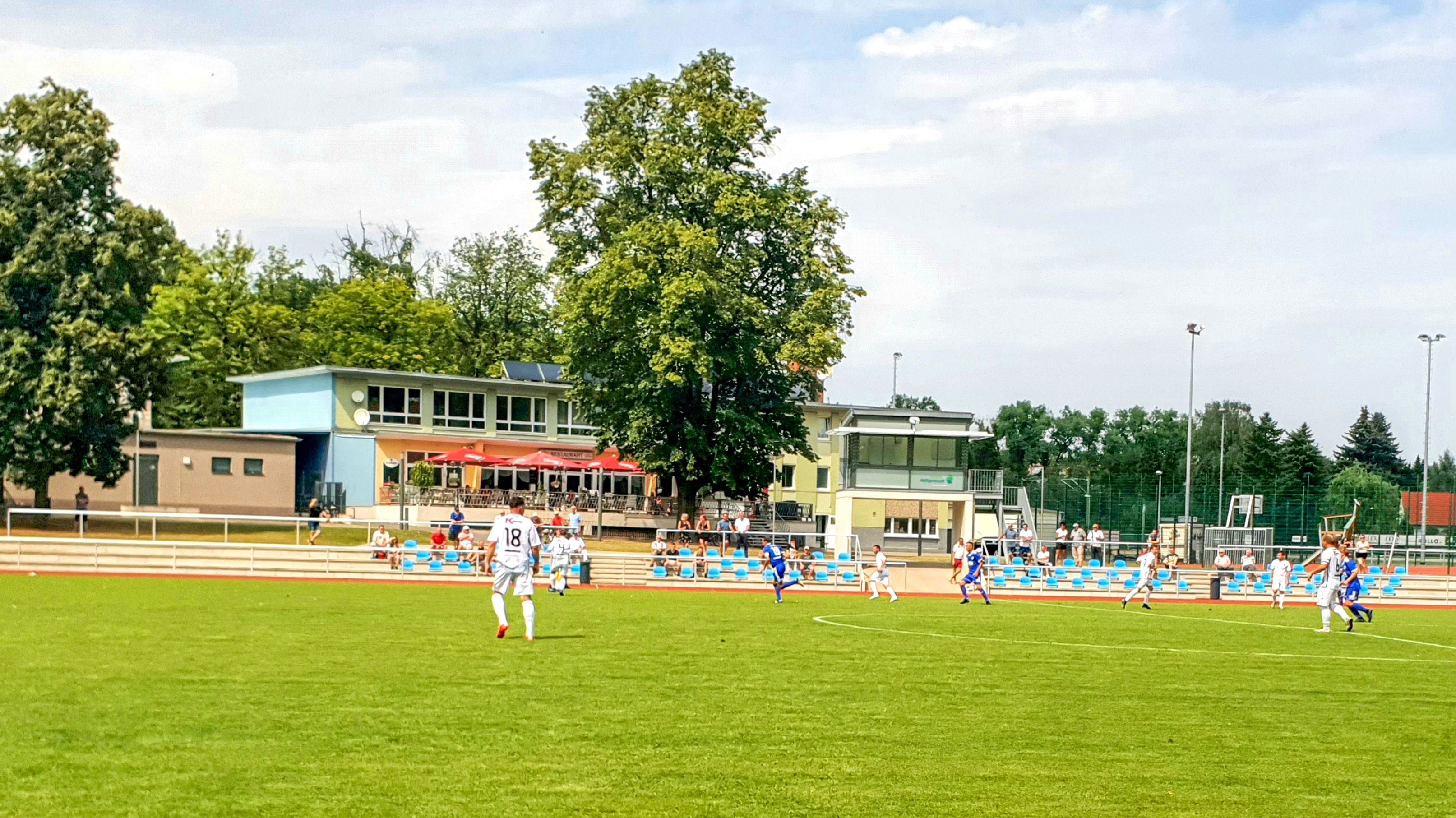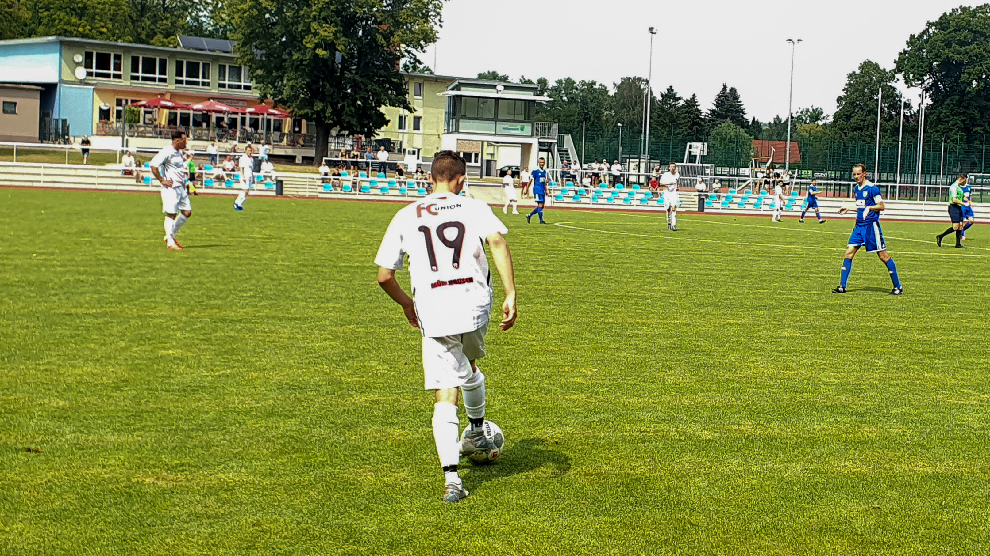 Bei der Hitzeschlacht im Eichsfeld mussten alle Aktiven den „inneren Schweinehund“ überwinden, und das taten sie bis zum Abpfiff. Die Unioner, bei denen im ersten Abschnitt A-Junior Niklas Lange das Tor hütete und nach dem Seitenwechsel der zum ersten Mal neu im Kader befindliche Niklas Barthel zwischen den Pfosten stand, hielten ordentlich dagegen beim Verbandsligisten. Union überraschte mit Sven Bernsdorf als Testspieler in der Startformation. Die ersten guten Chancen hatte Union in Person von Nico Damm und Sven Bernsdorf, beide scheiterten mit einem Heber aus halblinker Position an SC-Torwart Sternadel. In der nächsten Szene machte es Berni besser, fast von der verlängerten Torlinie war er mit einem „Lupfer“ zum 0:1 erfolgreich. Nun forcierten die Gastgeber das Tempo und hatten auch zwei Chancen, eine vereitelte Niklas Lang im Tor und die übrige wurde kläglich vergeben. Die Union-Abwehr stand sonst gut, davor ein laufstarkes Mittelfeld. Nach jeweils 15 Minuten gab es eine Trinkpause.